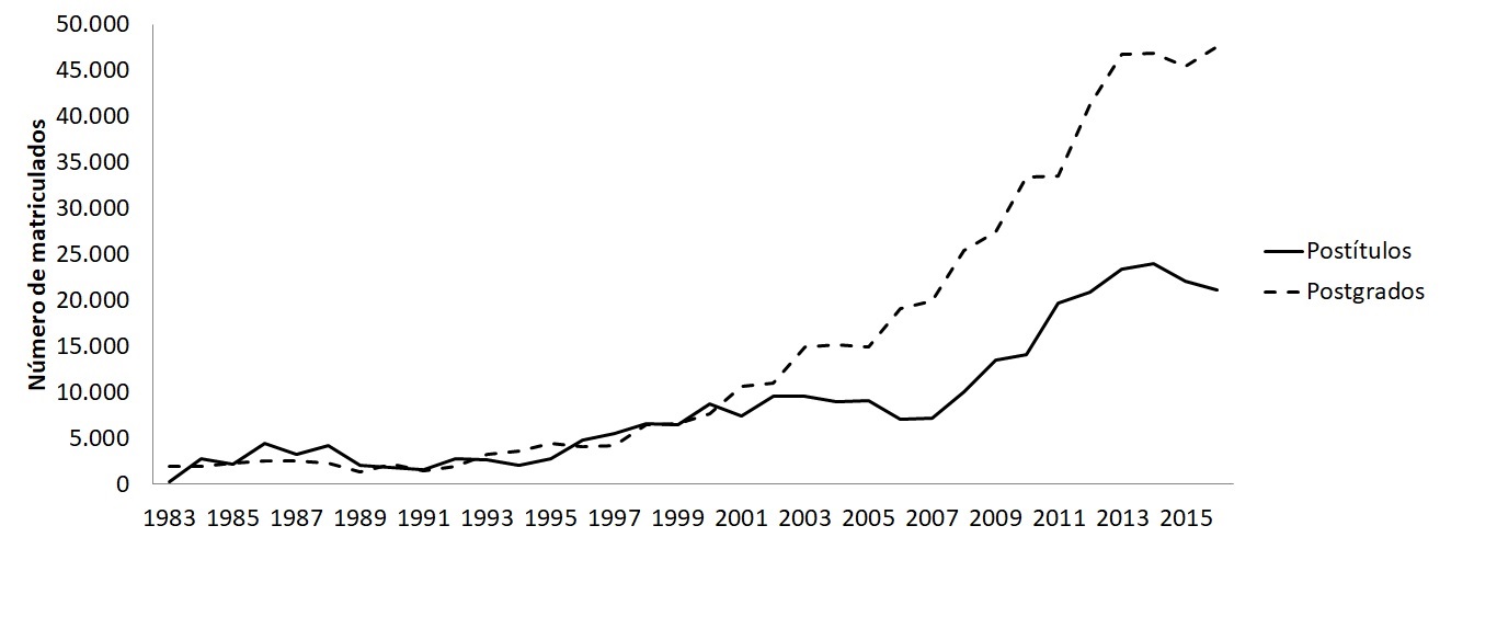 Figura 2. Evolución de las matrículas en programas de postítulo y diplomados en comparación con postgrados durante el período 1983-2016 en Chile. Datos obtenidos del Servicio de Información de Educación Superior (SIES), DIVESUP, MINEDUC.