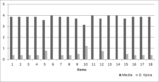 A tenor de la evidencia obtenida en relación a estos parámetros, el único ítem que pudiera requerir un análisis en profundidad es el ítem 10 (Tabla 2) por mostrar una desviación típica superior a 1 en ambos casos, aunque presenta una media superior a 3.