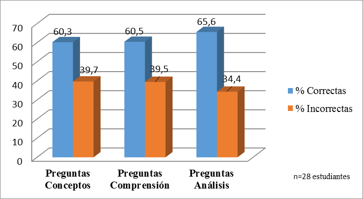 A los 28 estudiantes que participaron en este estudio se les aplicó la prueba de conocimiento y se obtuvo una nota promedio del curso de 4,3 (E.S=0,8). La distribución de porcentajes de preguntas correctas e incorrectas de cada tipo de pregunta del instrumento de evaluación se observa en la figura 1.