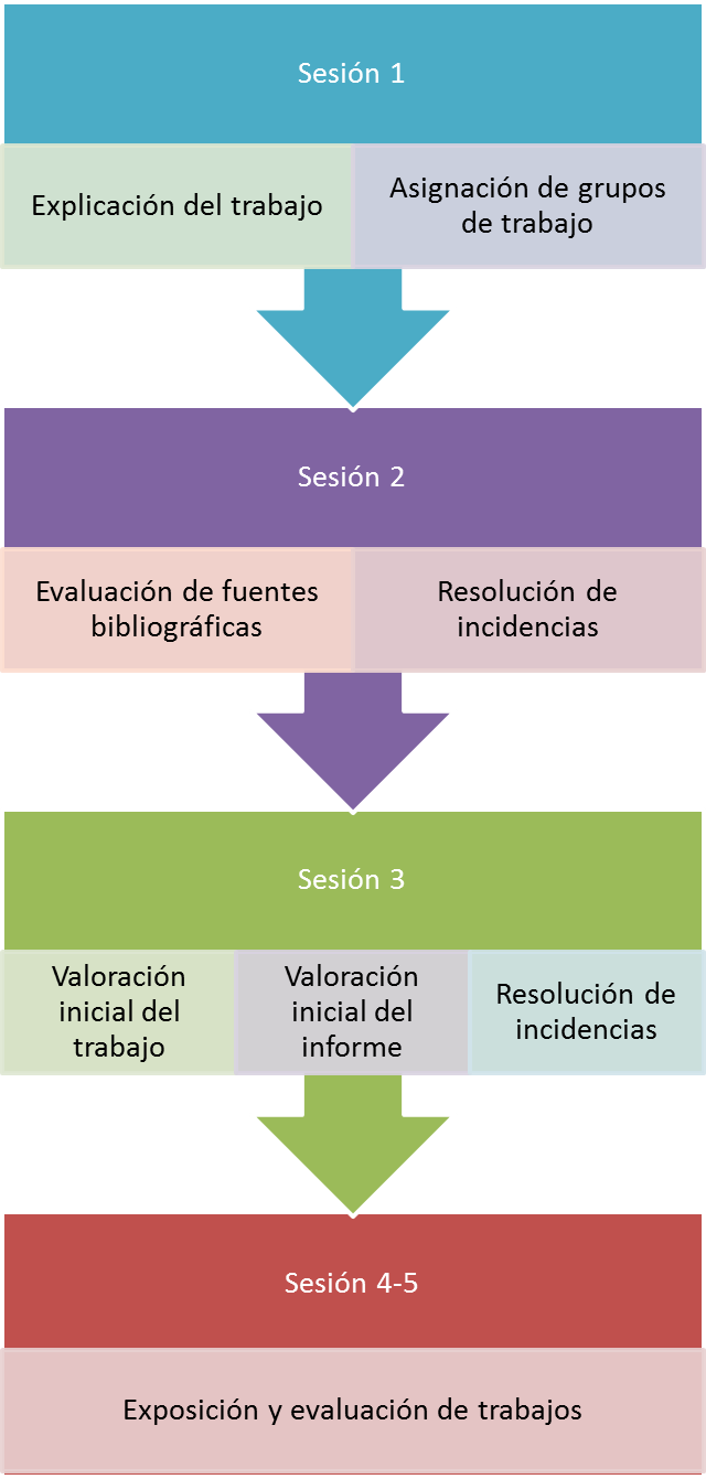 En la primera sesión, el docente informa al alumnado de los objetivos y criterios de evaluación establecidos para la realización del trabajo. Se comunican los diferentes trabajos propuestos y se explica cómo ha de realizar la inscripción a través del Campus Virtual en el término que desean realizar.