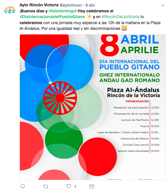 También se expresaban así otros usuarios de la red como Maribel Mora Grande: @MaribelMoraG al exponer la importancia del 8 de abril para recordar que la etnia gitana continua siendo vista de manera estereotipada, con prejuicios y discriminación: https://twitter.com/MaribelMoraG/status/982912939509342208.