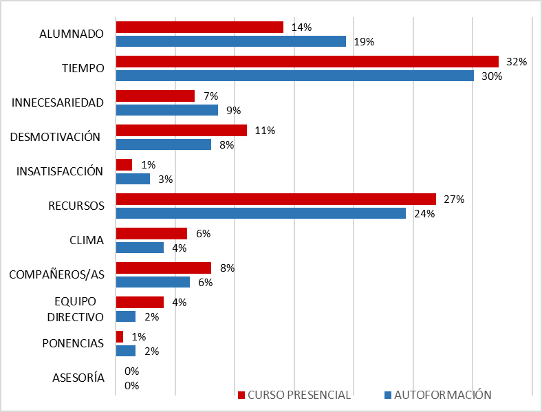 Del análisis de sus respuestas se desprende que el principal factor que propicia la transferencia es la capacidad para dar respuesta a las necesidades de los docentes. Cuando la adquisición de conocimientos y competencias es asumida como la solución a un problema, a una necesidad, los aprendizajes logrados son utilizados para mejorar el rendimiento profesional. En consecuencia, los participantes perciben mayores beneficios en aquella formación que responde a las necesidades de su puesto de trabajo. Este resultado se encuentra en consonancia con varios estudios relacionados con la materia (Ballesteros, 2008; Bates, 2007; González et al., 2017; Velada y Caetano, 2007) que lo señalan como un elemento decisivo para que se produzca y tenga éxito el proceso. En el lado opuesto, casi uno de cada diez percibe que el inadecuado ajuste de las actividades formativas a las necesidades laborales constituye un obstáculo que frena la aplicación. Sin duda, como apuntan diversos autores (Fernández, Rodríguez y Fernández, 2016) se ha de realizar una detección realista de las necesidades formativas del profesorado atendiendo a sus competencias profesionales y dirigida a que sirva de referente para diseñar planes de formación permanente y acciones formativas específicas.