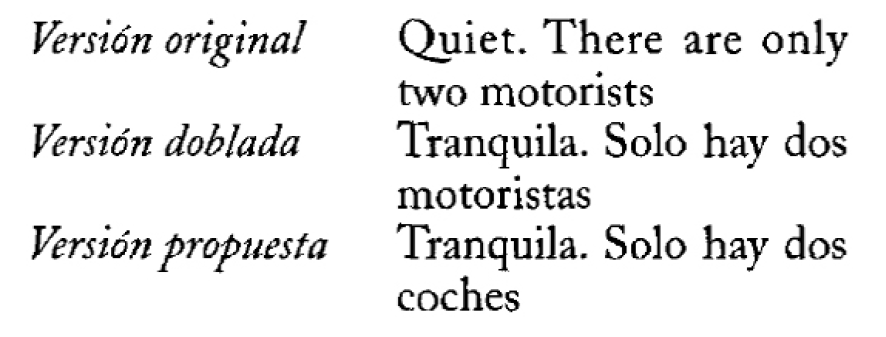 En el supuesto de que el traductor no hubiera tenido la oportunidad de ver la película antes de acometer la traducción del guión, le quedaba el recurso del sentido común, aderezado con el contexto de situación que le proporcionaba la escena: un muelle, madrugada, un barco sospechoso de transportar droga. ¿No serían sospechosos dos motoristas en las inmediaciones? En caso afirmativo, el traductor debería detectar la extrañeza de la situación e investigar el origen de la incongruencia. La primera verificación debe ser buscar el término objeto de la incongruencia en un diccionario: habitualmente es suficiente para subsanar la deficiencia de la versión traducida. Asimismo, el traductor debe desconfiar de los términos susceptibles de ser falsos amigos, y comprobar sistemáticamente todos aquellos casos en los que exista una coincidencia morfológica entre ambas lenguas. Clasificación: coincidencia lingüística.