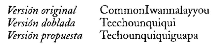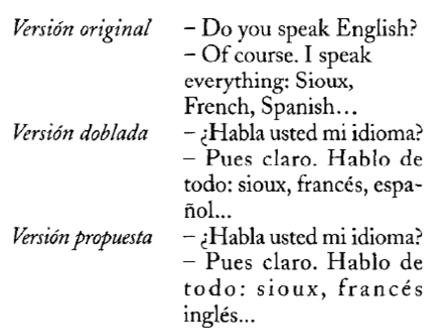 Por un lado, el traductor es consciente del trabajo de adaptación que tiene que llevar a cabo para superar el problema del idioma. Se ha extendido la práctica de sustituir English por mi idioma en un intento de no crear confusión e incoherencia en la versión doblada. Sin embargo, el traductor no repara en que este primer cambio condiciona la intervención posterior, lo que obliga a realizar otros cambios. Por lo tanto, cuando el indio americano enumera los idiomas que habla, se tendría que haber cambiado español por inglés o por cualquier otro idioma occidental, por ejemplo italiano o portugués.