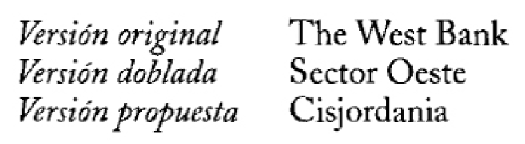 La dificultad de la intervención del detective es doble. Por un lado, se hace referencia a un elemento humorístico extraño para la audiencia meta, pero fácilmente interpretable por el contexto de situación y el contexto lingüístico, especialmente la entonación empleada por el personaje. Por otro, el verdadero problema del ejemplo: las deficiencias léxica y cultural mostradas por el traductor al no reconocer que West Bank no es un nombre común, sino el territorio palestino situado al oeste del río Jordán, de ahí el nombre en inglés.