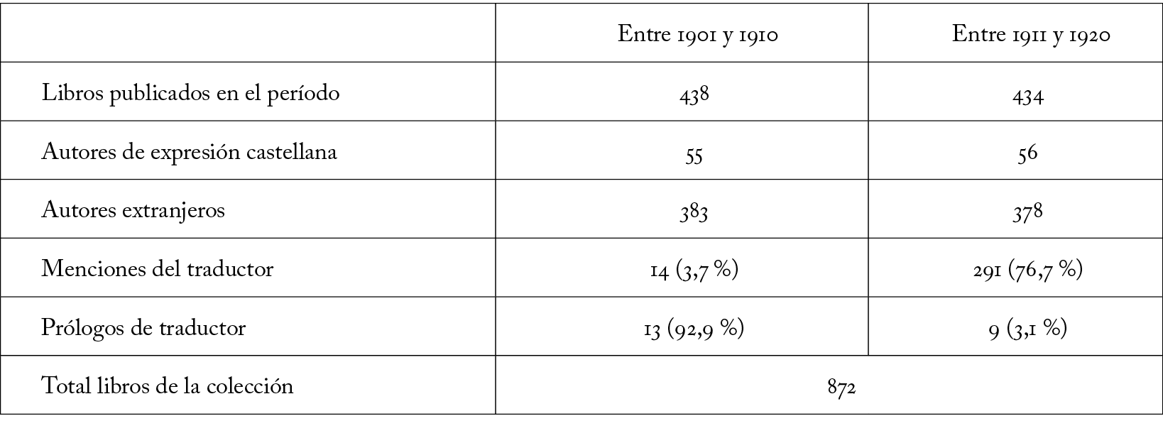 En los primeros diez años de la colección, la mención del traductor era esporádica; en 1911, puede decirse que se vuelve casi sistemática. En esos últimos años, casi todo lo que se publica pertenece al género novelesco. Hay algunas excepciones, sin embargo: teatro de Enrique Ibsen (El pato silvestre, El drama del mar, Brand, Casa de muñecas, Hedda Gabler, La unión de los jóvenes) y de Shakespeare (Hamlet), un ensayo de J. Michelet (El pájaro), así como cuatro relatos de viajes y un ensayo histórico traducidos por Carlos Aldao.
