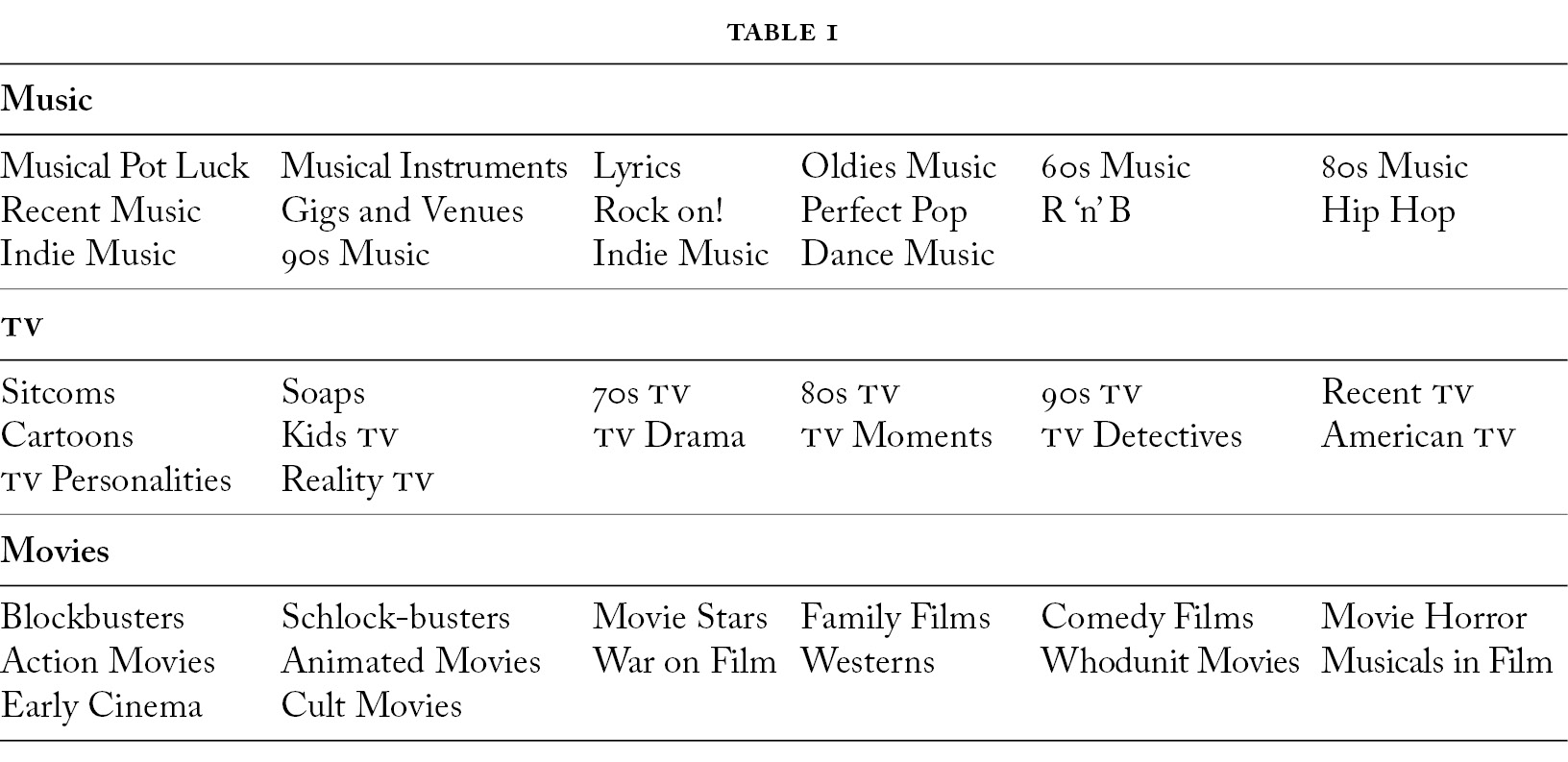 All questions in Buzz! are categorized. Each question can be placed in different categories, according to a set of rules and hierarchies. There are 10 ‘Main’ categories in Buzz! that are used to categorize the pool of 5000 trivia questions. These are: