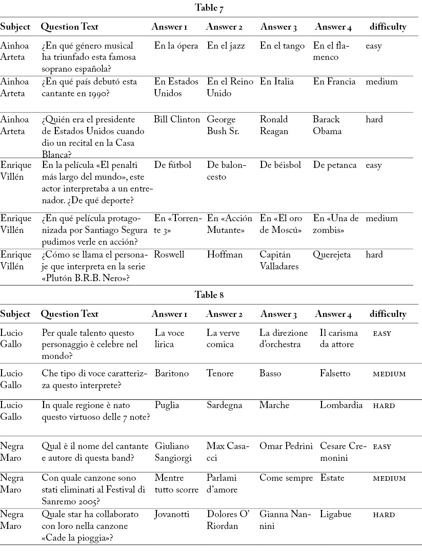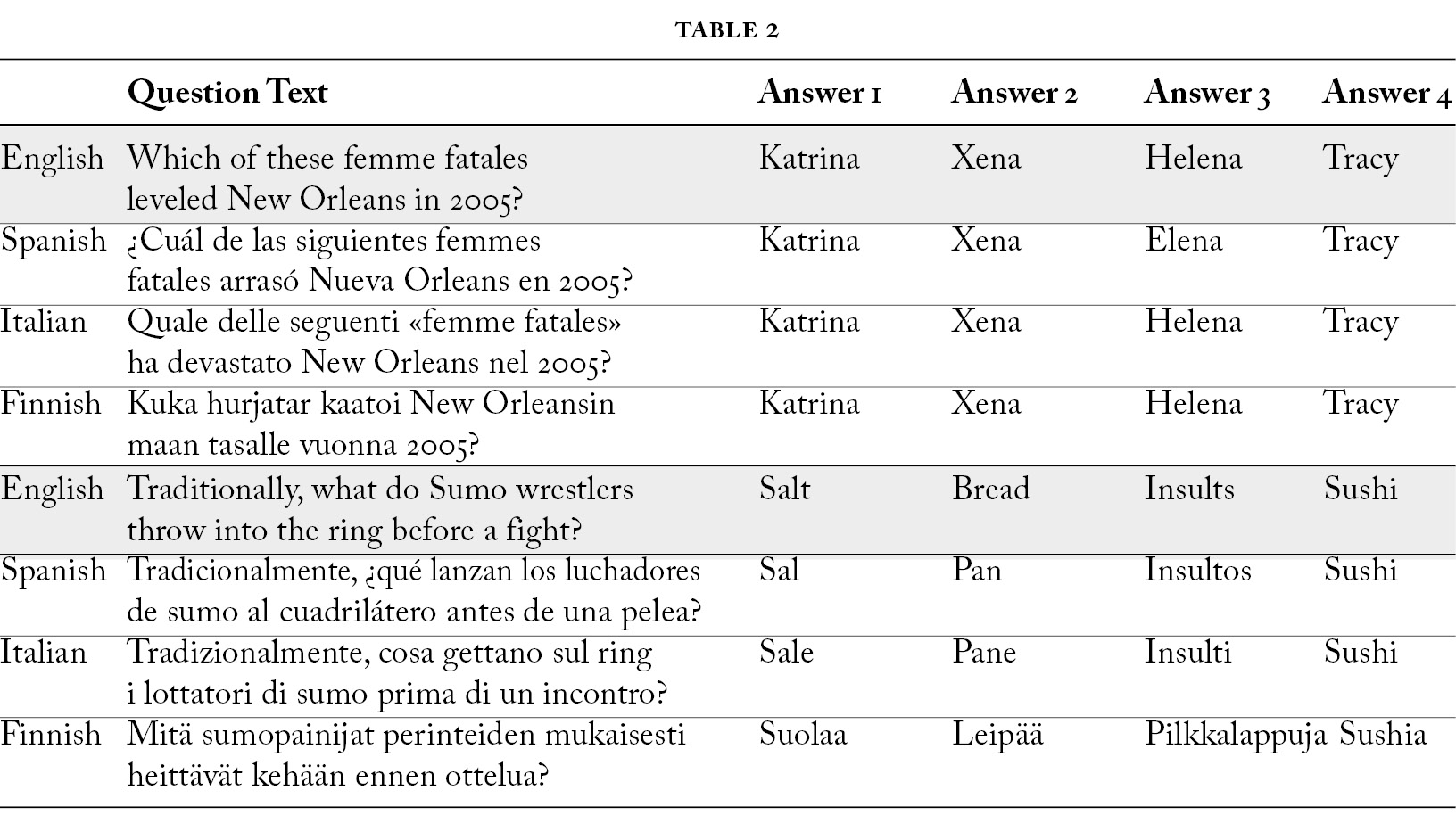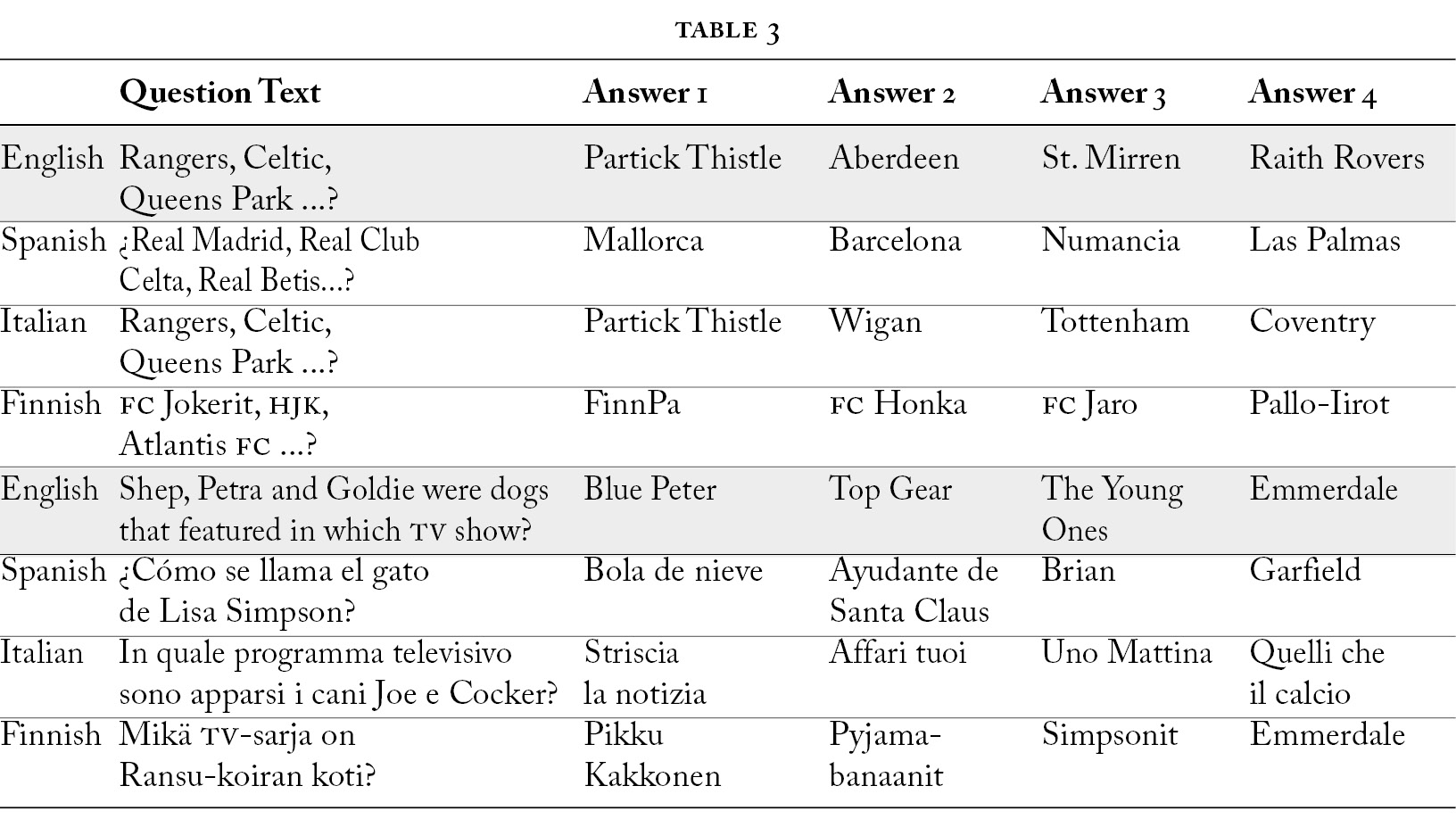 In the soccer question we can see the English and Italian share the same question. This is due to the fact that Italian writers opted to keep the original question and then adapt the four answers. Spanish and Finnish writers instead chose to keep the same subject, but to adapt the question as well.