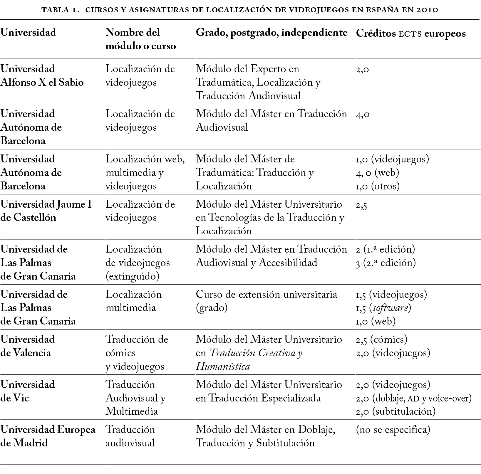 Con la llegada del siglo xxi, las universidades españolas comienzan a considerar la localización de videojuegos como una especialización perteneciente, bien a la rama de la localización, bien a la de traducción audiovisual. La primera en impartir de forma oficial un curso de localización de videojuegos es la Universidad Autónoma de Barcelona, que en el año 2005 incluye el módulo «Localización de videojuegos» en su Máster en Traducción Audiovisual (MTAV), este módulo es impartido por Carme Mangirón, profesora de la Dublin City University y traductora oficial de japonés a español de la saga de videojuegos Final Fantasy. Dos años más tarde le seguiría la Universidad de Las Palmas de Gran Canaria, que incorporó un módulo de Localización de videojuegos a su Máster en Traducción Audiovisual, Subtitulado para Sordos y Audiodescripción (MSA). A partir de esa fecha, la localización de videojuegos comenzó a extenderse al resto de universidades, aunque casi siempre dentro del marco de los estudios de postgrado. En la actualidad, existen al menos siete universidades y otros tantos programas de postgrado (entre másteres y expertos) que ofrecen la posibilidad de estudiar localización de videojuegos en España (tabla 1).