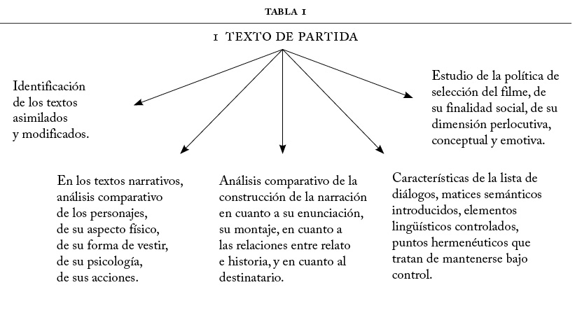 En primer lugar, se toma como objetivo la constitución de los textos de partida en tanto transformación de textos precedentes. En este caso, la pregunta básica sería: ¿cómo ha modificado el texto de partida esa textualidad precedente en lo que se refiere a los cinco niveles esenciales del signo audiovisual: pragmático, icónico, sonoro, sintáctico y semántico? Desmenuzando la pregunta, digamos que habría que determinar en general las siguientes cuestiones: