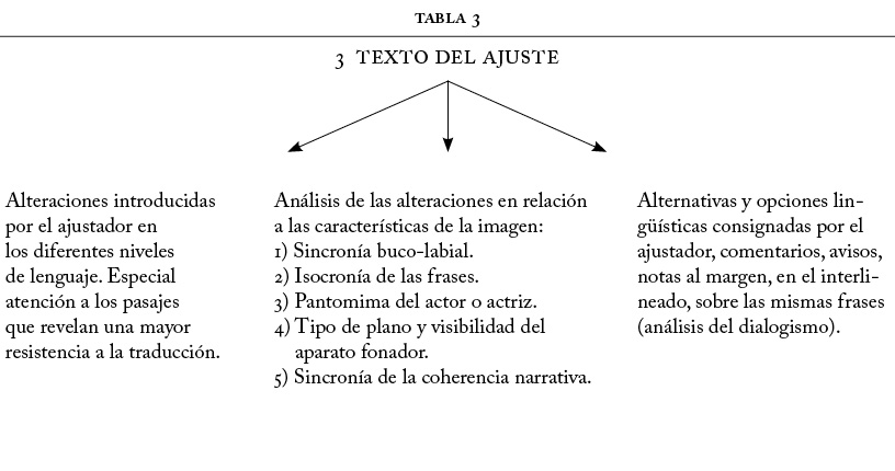 El tercer paso del análisis se centra en la siguiente fase de la elaboración del discurso del doblaje: el texto producido en el moldeamiento realizado por el agente ajustador o adaptador. El cometido fundamental de este paso es responder a la pregunta: ¿qué modificaciones ha introducido este agente ajustador en el texto de la traducción y qué determinaciones fílmicas lo han motivado? En esta fase es conveniente trabajar sobre las correcciones, sobre las tachaduras (si las hay), sobre las divergencias, en fin, entre el texto de la traducción que le sirve al ajustador de punto de partida y el texto al que este da lugar. En este momento aumenta la necesidad de trabajar a la vez con el palimpsesto creado por el ajustador y las imágenes del filme, la necesidad de tener en cuenta los diferentes códigos del signo audiovisual, y la manera en la que interaccionan entre sí. Veamos los puntos que sería conveniente tratar en este tercer paso: