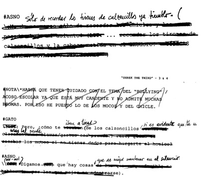 Este es el primero de los principios fundamentales del análisis genético que confirma una y otra vez la consulta de los documentos del proceso de doblaje: la inexistencia de un texto definitivo. El filme es, en la mayoría de los casos, una adaptación de diferentes tipos de texto (novelas, cómics, otros filmes, hechos reales, documentales, etc.), la lista de diálogos destinada al doblaje es una corrección llena de aclaraciones metalingüísticas proveniente del guión del filme, la traducción es una versión en lengua distinta que modifica la lista de diálogos, el ajuste es una corrección múltiple y desfigurativa de la traducción, etc. Lo que esta genealogía hace es disipar cualquier atisbo de identidad textual. El documento que presentamos (fig. 1), perteneciente a la etapa del ajuste de una escena del filme Shrek the Third (Chris Miller y Raman Hui, 2007), es una muestra excelente de lo que queremos decir cuando hablamos del carácter espurio, sucio, de palimpsesto, multicorregido, de la textualidad del doblaje: