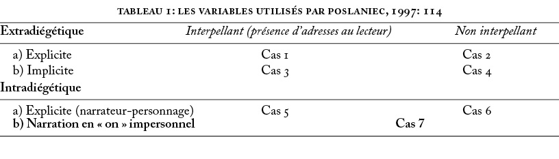6 « On peut même supposer que le narrateur est une figure en creux qui préexiste chez le lecteur réel » (Poslaniec, 1997: 40).