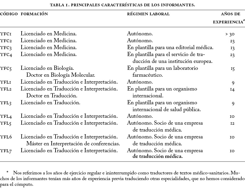Como puede observarse, prácticamente todos los informantes eran expertos, ya que, como señalaron durante las entrevistas, acumulaban un mínimo de diez años de ejercicio regular y continuado (Bloom, 1985) en el ámbito de la traducción médica. Consideramos, por tanto, que sus respuestas (véase apartado 4) están sólidamente fundamentadas en su amplia experiencia como traductores médicos profesionales.