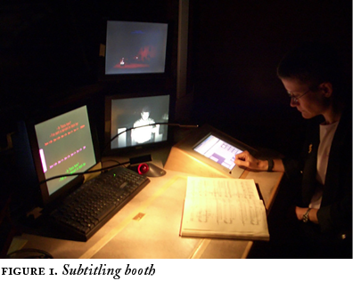 At Liceu, subtitles and surtitles are created and delivered from a purpose built booth as can be seen in Figure 1 below. Subtitles are projected by a person every night following the music score, not a given time code. This is due to the fact that every night the performance can vary, and synchronised subtitles are a must.