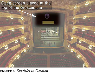 At present, Liceu offers subtitles in English, Catalan, and Spanish, with surtitles in Catalan, placed at the top of the proscenium, as can be seen in Figure 2.