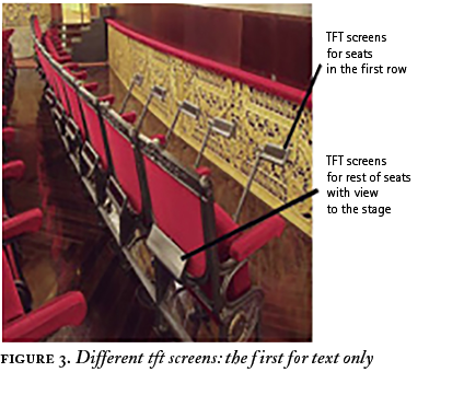 Multilingual subtitling is possible thanks to the screens included in the rebuilding after the 1994 fire. Two different types of screens, TFT and TXT, were built in the seats as can be seen in Figure 3: TFT as a TV (image and subtitle) and TXT (only with text).