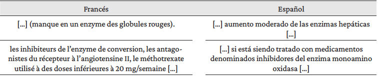 En nuestro caso son especialmente relevantes los casos que podrían resultar en una propuesta de traducción poco idiomática o, tal y como demuestran las frecuencias de uso de nuestro corpus, en propuestas que no se corresponden con lo más empleado en este género textual. Así, observamos el caso de méthode contraceptive (1) que, como especificábamos anteriormente en el apartado de variación de número, la equivalencia más frecuente la presenta medidas anticonceptivas (20). No obstante, encontramos también el equivalente métodos anticonceptivos, con una frecuencia de uso muy inferior (3), la cual se localiza únicamente en un prospecto de medicamentos de ácido acetilsalicílico, mientras que medidas anticonceptivas se encuentra localizada de manera homogénea en todos los prospectos de atorvastatina. Estas propuestas poco extendidas y con una frecuencia mucho menor que las empleadas en el género textual se pueden deber a interferencias bidireccionales que se dan en lenguas afines y que generan soluciones automatizadas (Cagnolati, 2015), principalmente ante una construcción que tendría sentido traspasar de manera literal en la lengua meta.