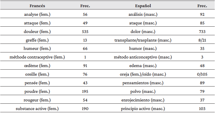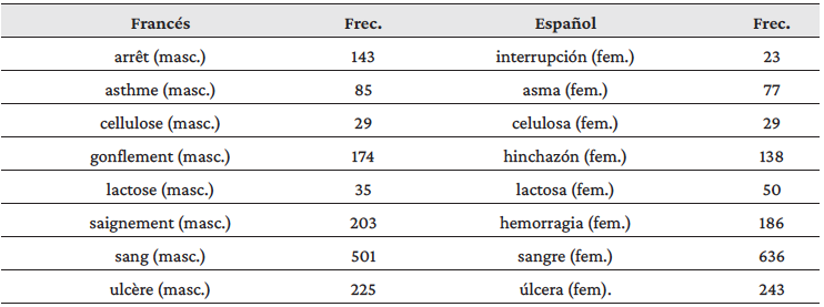 Tabla 5. Variaciones de género gramatical entre francés y español en el lenguaje médico: masculino francés y femenino español