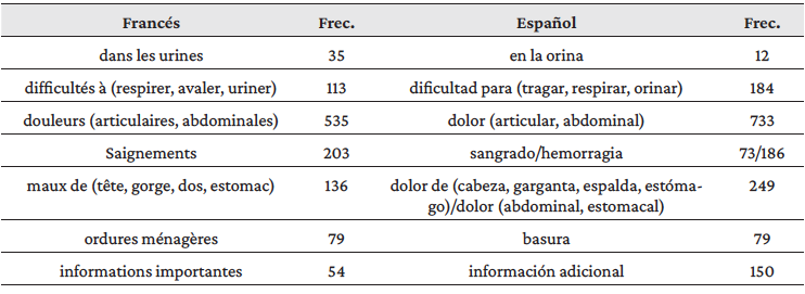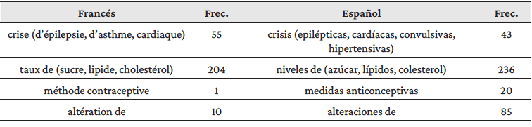 Los casos que menciona la autora, y que exponemos anteriormente, se repiten en el corpus objeto de estudio, tal y como mostramos a continuación. En la siguiente tabla (véase Tabla 2) se observa una tendencia por parte del francés a pluralizar al existir diferentes modalidades de aparición de enfermedades o enfermedades que afectan diferentes órganos, así como otras unidades léxicas que recurren al mismo patrón morfológico: