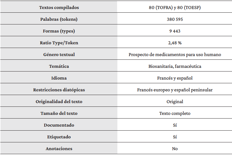 Como se desprende del número de palabras proporcionadas en la Tabla 1, el corpus compilado es un corpus comparable ad hoc. En este tipo de corpus, la cantidad de palabras no suele contemplarse como una característica prioritaria, sino que es la calidad de los textos lo que posee una mayor relevancia (Corpas Pastor, 2001), avalada dicha calidad en nuestro caso por la descarga de los prospectos oficiales mediante las plataformas gubernamentales de Francia (ANSM) y de España (CIMA).