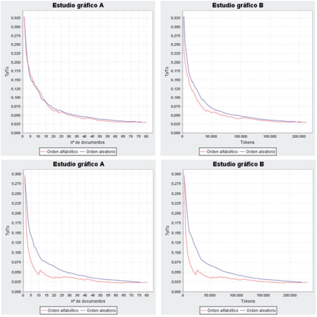 Al tratarse de un género textual breve, conciso y con una variación sintáctica y léxica muy baja, la representatividad del corpus se puede alcanzar con un número reducido de textos, tal y como se observa en la siguiente ilustración (véase Figura 1), realizada con el programa ReCor (creado por Gloria Corpas Pastor, Miriam Seghiri Domínguez y Romano Maggi, Universidad de Málaga ):
