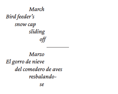 The two last lines pose another problem: there are no verbs in Spanish formed by two words, such as “slide off.” In contrast, reflexive verbs such as “wash oneself” / “lavarse” (formed from “wash” / “lavar”) are quite common, and the case is applicable here: “resbalando-se.” The implicit nuance is that the bird feeder’s snow cap slides because of the very weight of the snow itself, without any external help. I have, therefore, replaced a prepositional particle by a reflexive pronoun particle.