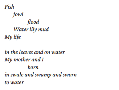 The weight of alliteration (specifically, the repetition of initial consonants in words) as a source of communication through sound instead of merely through semantic meaning is of course inherent to all poetry in English, and a powerful resource in Niedecker’s poems. Its translation into Spanish relies, to a certain extent, on looking for alternative repetitions of initial consonants. The strategy is visible in the memorable opening of “Paean to Place,” one of her most important compositions: