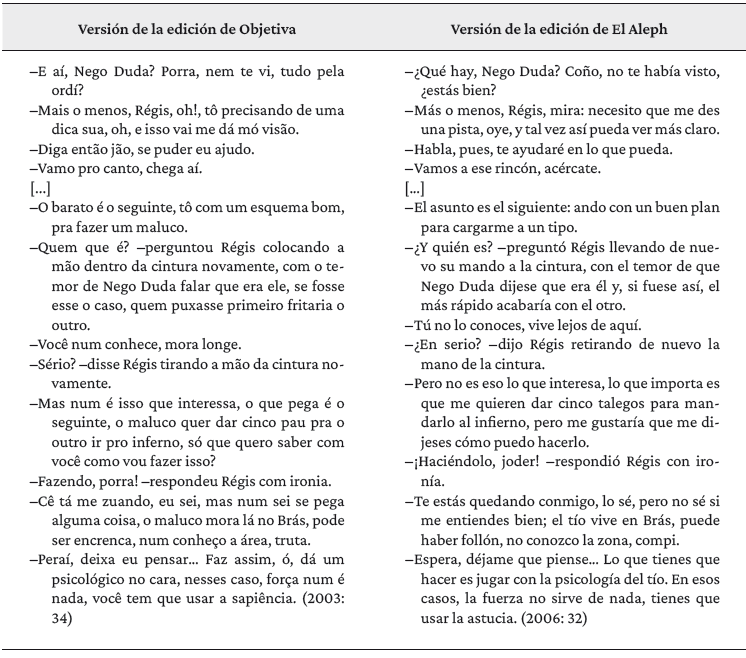 Palabras como «maluco» ‒«loco» traducido literalmente, aunque en este caso «fazer um maluco» adquiera el sentido de «matar a alguien»‒, pierden su carácter jergal al ser traducidas de forma estandarizada, sin ningún tipo de vinculación con el habla de la calle: la expresión «fazer um maluco» en la versión española podría traducirse como «cargarme a un tipo», que es la opción que toma El Aleph, pero mejoraría su coloquialidad si en vez de «tipo» se traduce como «tio», más común en el lenguaje popular. También ocurre lo mismo con la palabra «barato» —«O barato é o seguinte»—, que es traducido como «asunto» —«el asunto es el siguiente»—, una traducción literal a nivel semántico pero que de nuevo pierde su carácter habla popular: en el caso podría ser sustituida por «movida» —«la movida es la siguiente»—.
