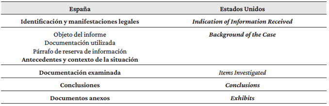 En la tabla 1 se muestra de forma comparada las partes del informe en ambos países (en negrita las que consideramos por la información teórica aportada que coincidirían):
