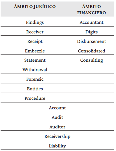 Como se puede observar en esta lista, el tipo de términos que se detectan con más frecuencia proceden del ámbito jurídico y económico. Sin embargo, no podemos incluir estos términos de forma independiente en un único ámbito de especialización, puesto que una de las características de los informes periciales contables que se usan en el ámbito judicial en ambos idiomas es que estos pueden considerarse como textos de tipo híbrido. Así se indicaba en la introducción al señalar que en el ámbito en el que se enmarcan estos documentos confluyen tanto aspectos jurídicos como económicos con el objetivo de investigar posibles fraudes en el seno empresarial (Singleton y Singleton, 2010). Asimismo, en el marco teórico recogimos estudios previos en los que se hace referencia a textos que no siempre se pueden situar en un campo temático determinado (Mayoral y Díaz, 2011), ya que no siempre se pueden separar materias como la traducción económica y jurídica (Borja, 2000 y 2013; Mateo, 2014; Mayoral, 2002).