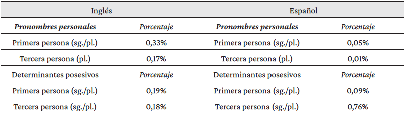 Al tratarse de un texto objetivo que incluye cifras y datos analizados, el emisor toma parte activa en la redacción del documento y eso se observa en el uso que se hace tanto en inglés como en español de la primera persona del singular y del plural. Destaca especialmente la personalización que toma el texto en español con el uso de los determinantes posesivos de primera persona. En la tabla 17 se muestra un resumen de los datos del análisis en la que se incluye el porcentaje, del total de palabras, en el que se emplean estos elementos verbales: