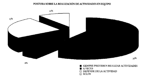Dentro de esta sección, podemos resaltar la pregunta número 1 y la 3 de la encuesta. Con respecto a la primera pregunta, todos los alumnos comentan haber realizado actividades en equipo, la mayoría de éstas de carácter deportivo o académico. Con respecto a la tercera pregunta, la mayoría de los alumnos, un 59%, prefiere realizar actividades en equipo; el 6%, a veces; el 25% admite que va a depender del tipo de actividad; un 10% del total confiesa preferir trabajar solo (véase gráfico en el anexo).