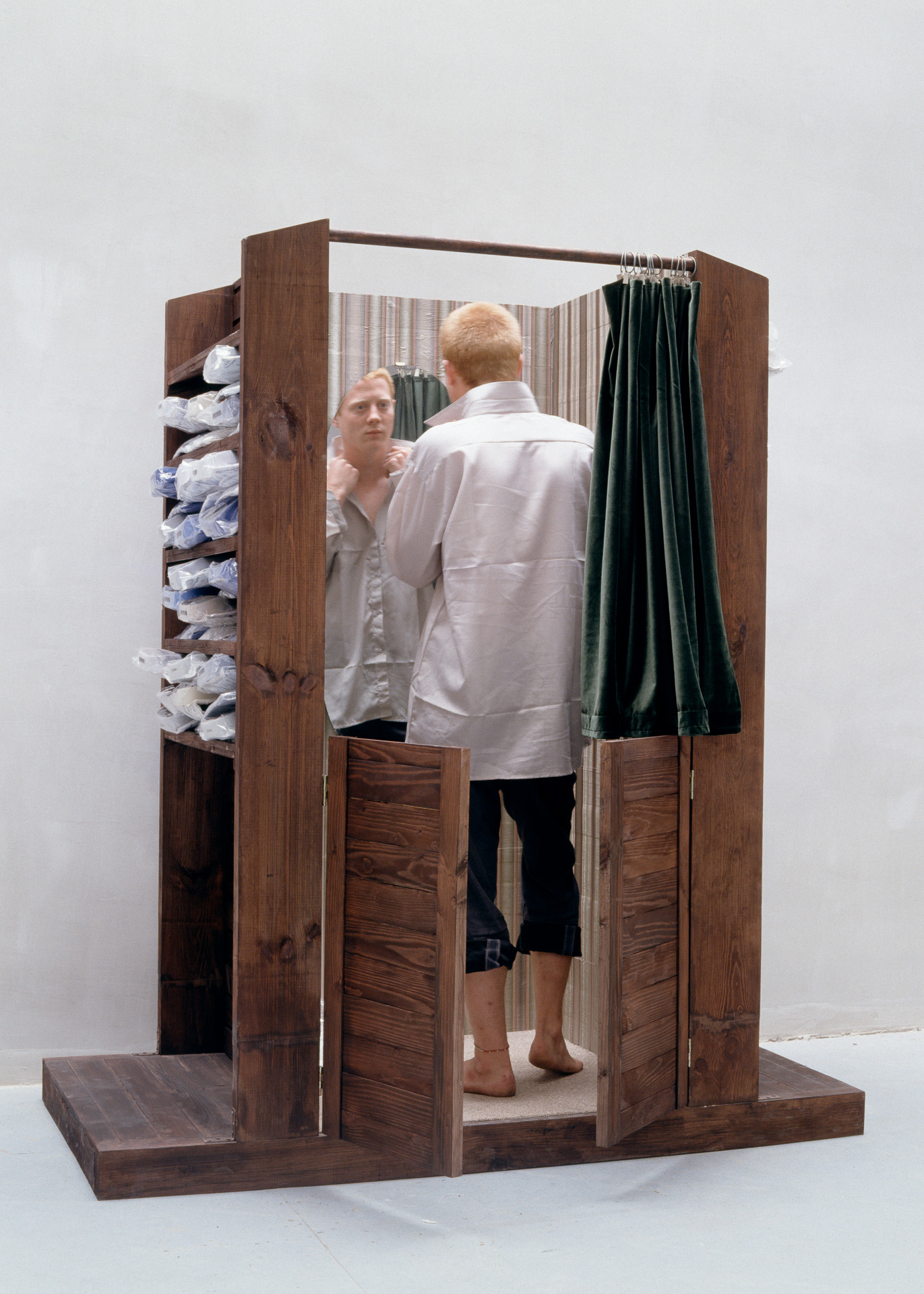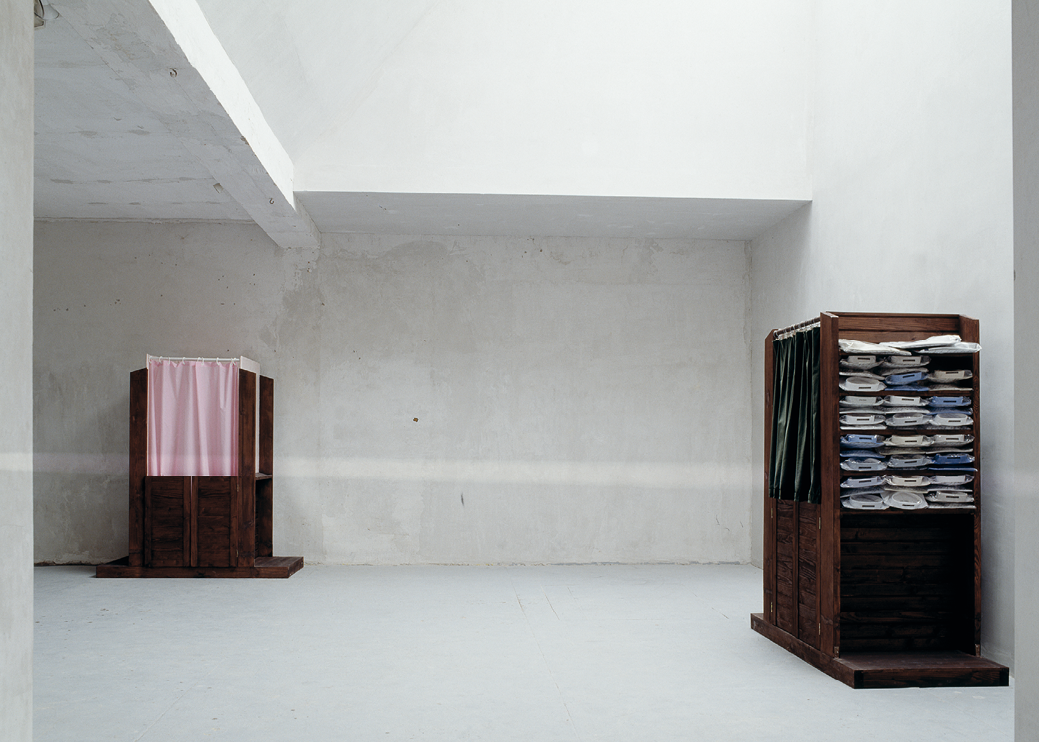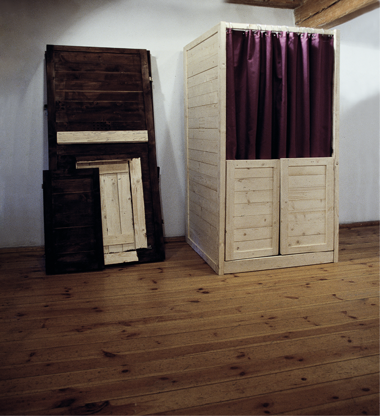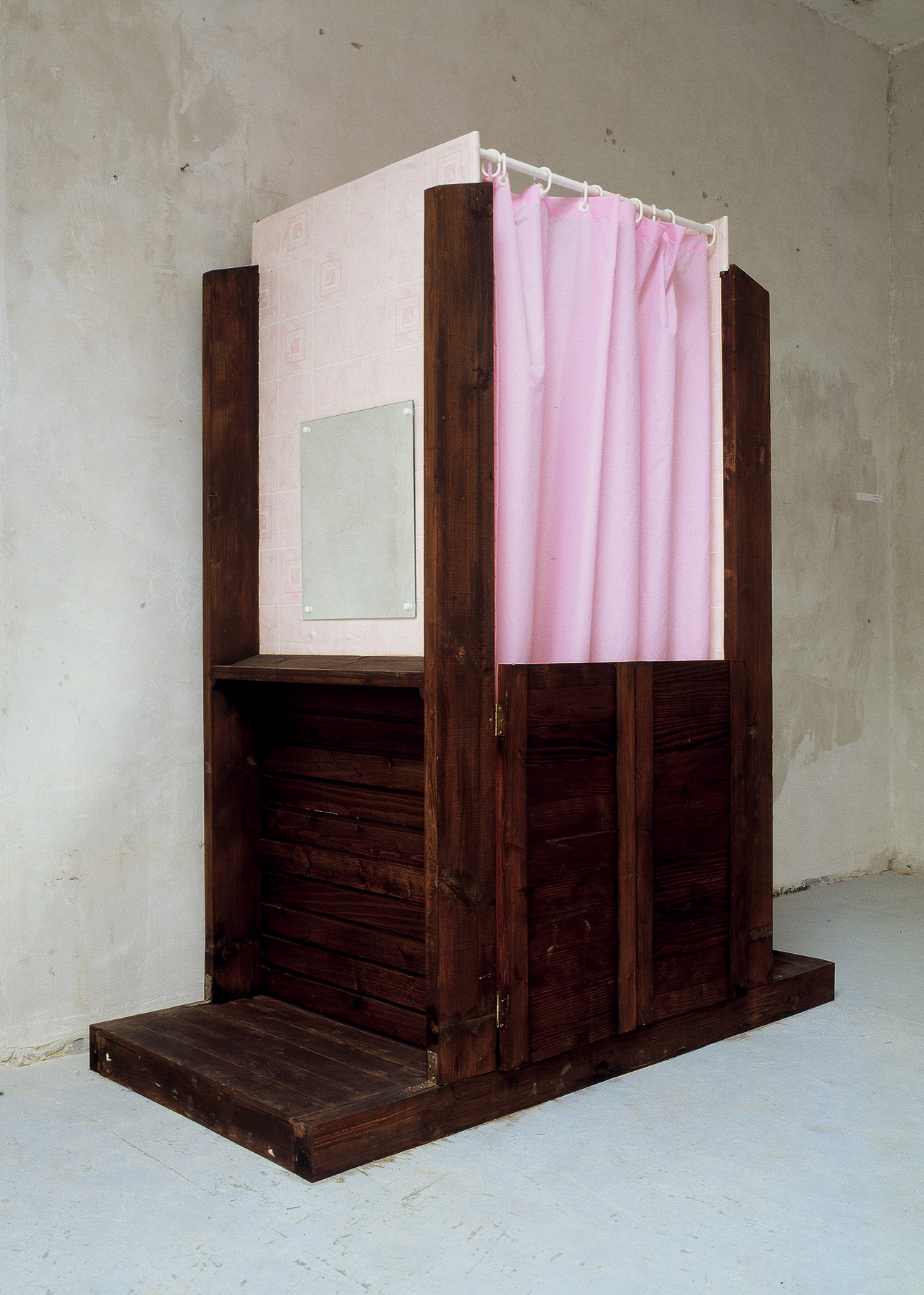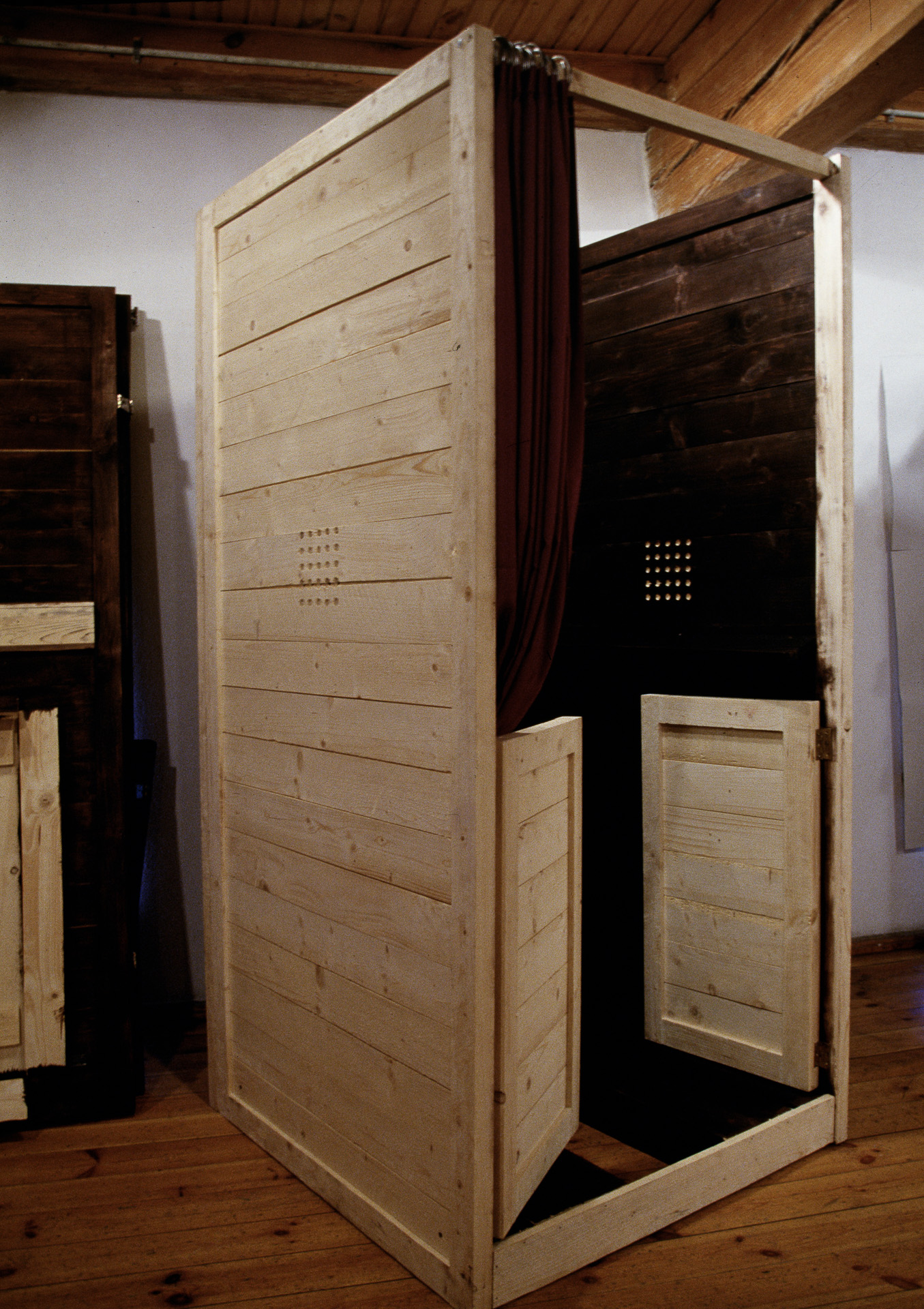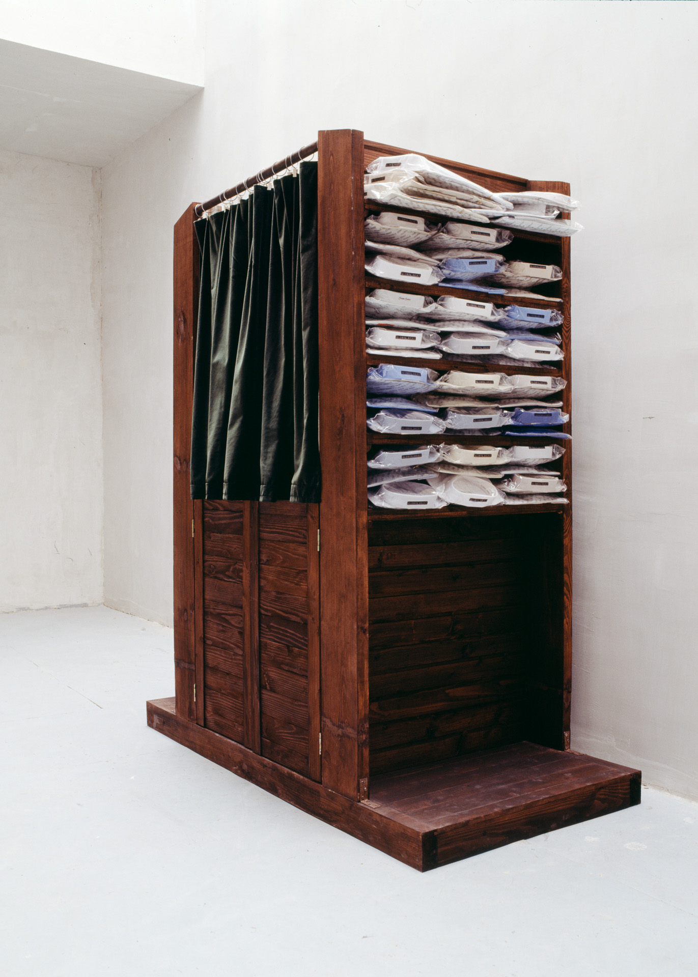Taking each work separately, on the other hand, he recalled: “The Confashional is an object that is a cross between a changing room and a confessional box. You can go inside and try on one of the shirts that the artist has hung above the kneeler. Another work, entitled Wash and Go, under the guise of a confessional hides a shower cubicle that can be used during the exhibition. What we have here is an ironic play on meanings, because the confession is also a symbolic cleansing, a purification or renewal, or a new, clean garment. The relationship of these objects to the confessional can also be found in terms of measurement, because they are, after all, made to measure, and assume that person’s isolation. Another object in this series, The Interior Layout (plates 12–13), is a confessional turned inside out, with the kneelers for the faithful inside, and the potential confessor outside. This simple trick creates no end of new meanings (…)”.22