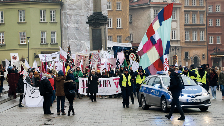 Plate 17. / View of the building to which the BWA Warszawa gallery moved in 2018, on ul. Marszałkowska in Warsaw (Poland) – the section between Plac Konstytucji (Constitution Square) and Plac Zbawiciela (Salvation Square). Image taken on November11 2018 during the National Independence Day march. Visible on the balcony is the spontaneous performance by the 100 Flags Collective. The event accompanied the 100 Flags for the Centenary of Polish Women’s Right to Vote march. A video of this event was then shown at the Between Salvation and the Constitution exhibition; image: Rafał Żwirek; Courtesy of the 100 Flag Collective.