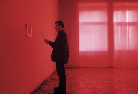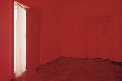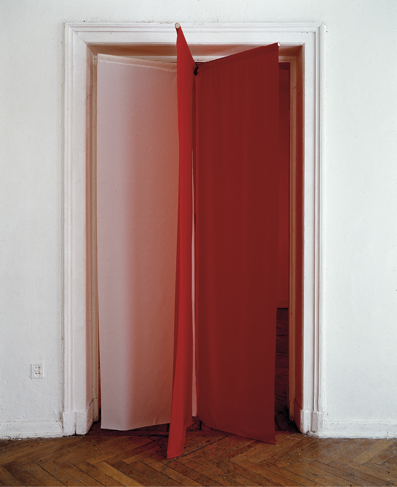 The subject of national symbols was something I also approached many years ago. It is another concept that has come back to me from a bygone age. In the Wschodnia Gallery in Łódź, I made a work called Poland Now (plates 22–27). The site-specific installation consisted in incorporating the red and white colors of the Polish flag into two interconnected rooms. Magdalena Bojarska described the existing space as follows: “The artist (...) has made it for the requirements of a specific interior (...). She has used two rooms as a place where the two colors characteristic for our Polish identity – red and white – function together. She has managed to get the colors to interact by covering the large panes of windows with (...) colored material. So in the red room, red is actually only the light that seeps through the window, and it feels like everything has taken on that color. She has turned the passage between the rooms into a revolving door made of white and red stripes of fabric. So you can twist them around to mix up the original colors of the rooms a little”.32 In each room there was also a container holding leaflets. “In the white room, clean and innocent (we all carry this code inside us), there are leaflets for apartments for sale. Among them is an advertisement for the artist’s apartment. In the red one, wild, but also hiding some danger, foreshadowing evil (again obvious associations), she has placed offers from escort agencies. Not only do the colors used correspond to the content associated with them, but they even emphasize them. The link that binds this double-track content is the graphic symbol Teraz Polska [Poland Now] and the message associated with it”.33
