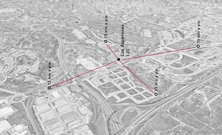 Based on the 15 Minutes City theory, which explores the idea of a sustainable city, is established the spatial-temporal measure in which each citizen should have access, on foot or by bicycle, to the fundamental services. How far away are the residents of Los Asperones from this parameter? Starting from the neighborhood and within a radius of 15 minutes, we travel through this waste area of the city of Malaga, where more than 150 families simulate daily the game of living.