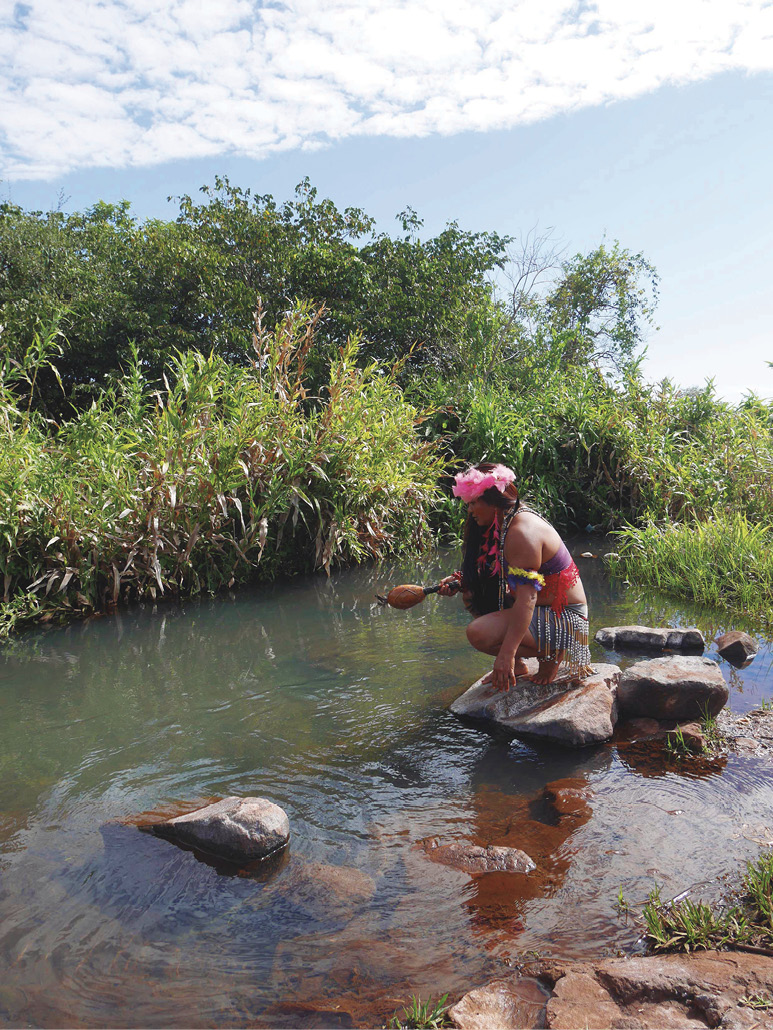 Image 2. «Kunha Ysapy wearing Guaraní typical costumes in a stream at the Bororó Village, Indigenous Reserve of Dourados». Photo by Letícia Larín. Dourados, Brazil. 2020. (Source: © Rosilei Souza)
