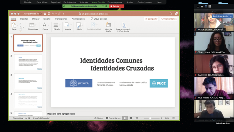 This project is a COIL initiative that starts from the Pontificia Universidad Javeriana (PUJ) of Cali, Colombia and that this time is working with the Pontifical Catholic University of Ecuador (PUCE). Aimed at first-level students of Graphic Design careers and executed in five weeks in face-to-face mode with remote assistance.