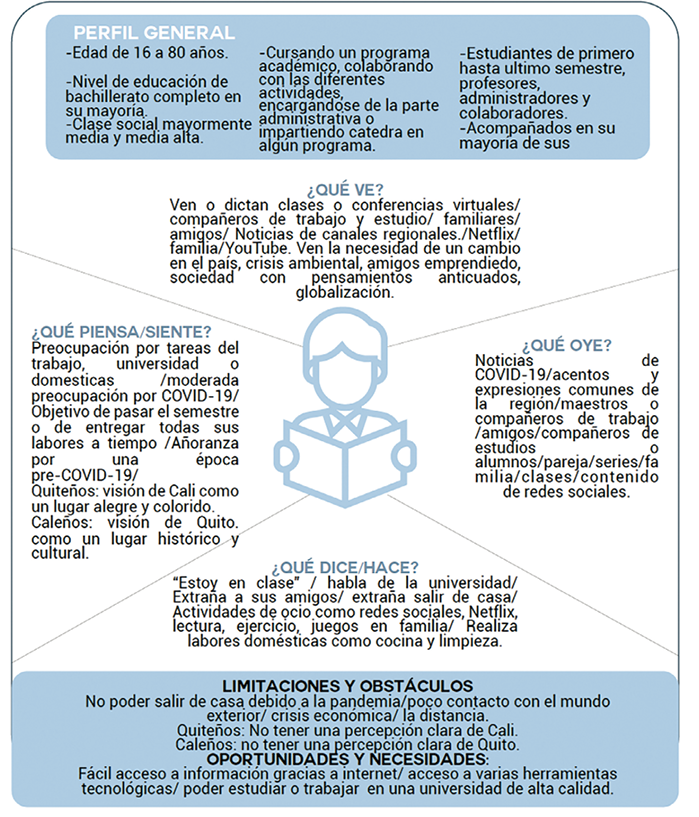 Fig. 10. Mapa de empatía. 2020. Fotografías extraídas de trabajos de estudiantes de primer nivel, primer semestre 2020 de la Pontificia Universidad Javeriana (PUJ) de Cali y Pontificia Universidad Católica del Ecuador (PUCE).