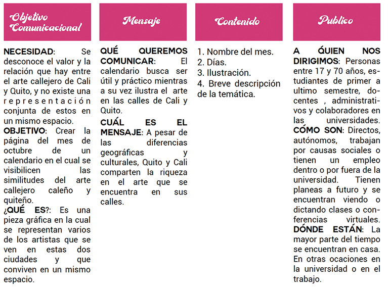 Para este proyecto se planteó como objetivo desarrollar un calendario intercultural que, a través de una propuesta gráfica, refleje los aspectos culturales y sociales más relevantes de los Centros Históricos del DMQ y Cali.