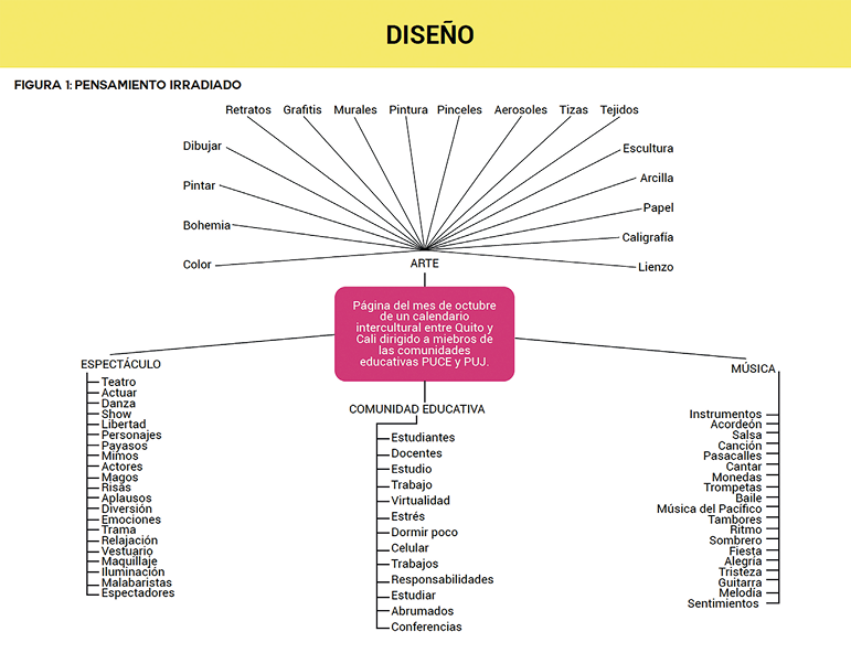 Fig. 13. Pensamiento irradiante. 2020. Fotografías extraídas de trabajos de estudiantes de primer nivel, primer semestre 2020 de la Pontificia Universidad Javeriana (PUJ) de Cali y Pontificia Universidad Católica del Ecuador (PUCE).