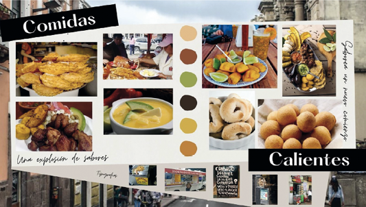 A continuación, se presentan algunos de los trabajos realizados por los grupos de estudiantes, en el caso del primero, correspondiente al grupo de comidas calientes que parafraseando sus palabras mencionan que identificaron las comidas calientes más representativas y similares de ambas ciudades, sus texturas, patrones, representaciones gráficas de la vestimenta de los vendedores, sus utensilios y los lugares en los que se ofertan, tomando en consideración la cromática que rodea a este tipo de alimentos, además de códigos visuales muy representativos como la típica sombrilla de las ventas ambulantes y la tipografía que refleja los letreros hechos a mano.