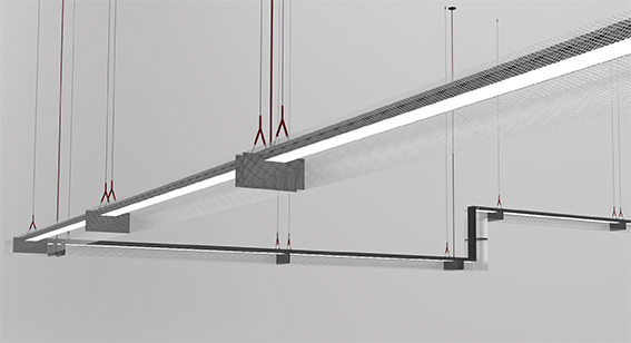 En la misma línea, en 2019 se diseñó Net / Iluminación acústica (Fig. 02), una luminaria de uso comercial o industrial, con una particularidad y es que presenta una malla metálica fonoabsorbente y transparente que actúa a la vez de difusor.