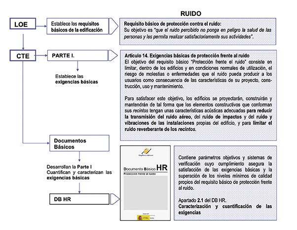 Hoy en día existe una normativa que regula cada aspecto de la construcción para asegurar unos estándares mínimos de calidad, de manera que el usuario cuando disfrute de alguna edificación lo haga en unas condiciones óptimas. Esto mismo pasa con el acondicionamiento acústico, aunque desde no hace mucho, pues, aunque sí existían exigencias en cuanto al aislamiento, la primera normativa que reguló el acondicionamiento fue el Documento Básico HR. Protección frente al ruido [N1] de septiembre de 2009 (Fig. 04). Este DB se deriva de la LOE [N7] (Fig. 05), donde se establecen las exigencias básicas que deben cumplir los edificios para satisfacer los requisitos básicos (Documento básico HR, 2016).