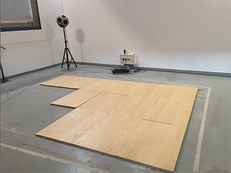 La muestra se instaló directamente sobre el suelo, poniendo 3 filas de 6 tableros que cubrían una superficie aproximada de 10.8 m2. Alrededor de la muestra se instaló un perímetro de listones de madera para cubrir los bordes. Las juntas entre tableros se taparon con cinta adhesiva. (Fig.20,21 y 22).