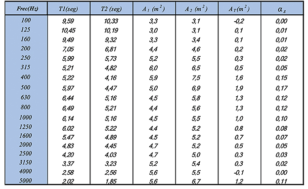 En la primera tabla (Fig.24) se reflejan los tiempos reverberación promedio (con muestra, T2 y sin muestra, T1), y del coeficiente de absorción sonora, αs, todo ello en bandas de tercio de octava. También se presenta una gráfica (Fig.23) con los tiempos de reverberación promedio, T1 y T2.