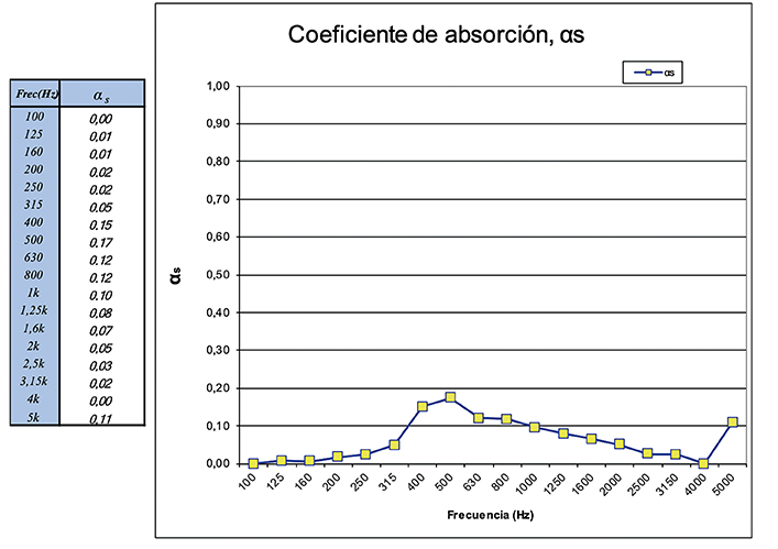 En la (Fig.24) se presenta una descripción de la muestra ensayada y una tabla y gráfica del coeficiente de absorción sonora, αs, en bandas de tercio de octava.