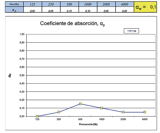 En la (Fig.25) se presenta una gráfica y una tabla del coeficiente de absorción sonora calculado en bandas de octava, αp, así como un valor global del coeficiente de absorción sonora ponderado, αw, calculado según la norma UNE EN ISO 11654:1998 junto con su indicador de forma (si hubiere), así como la clase de absorción acústica del absorbente según la tabla B.1 del Anexo B de la misma norma.