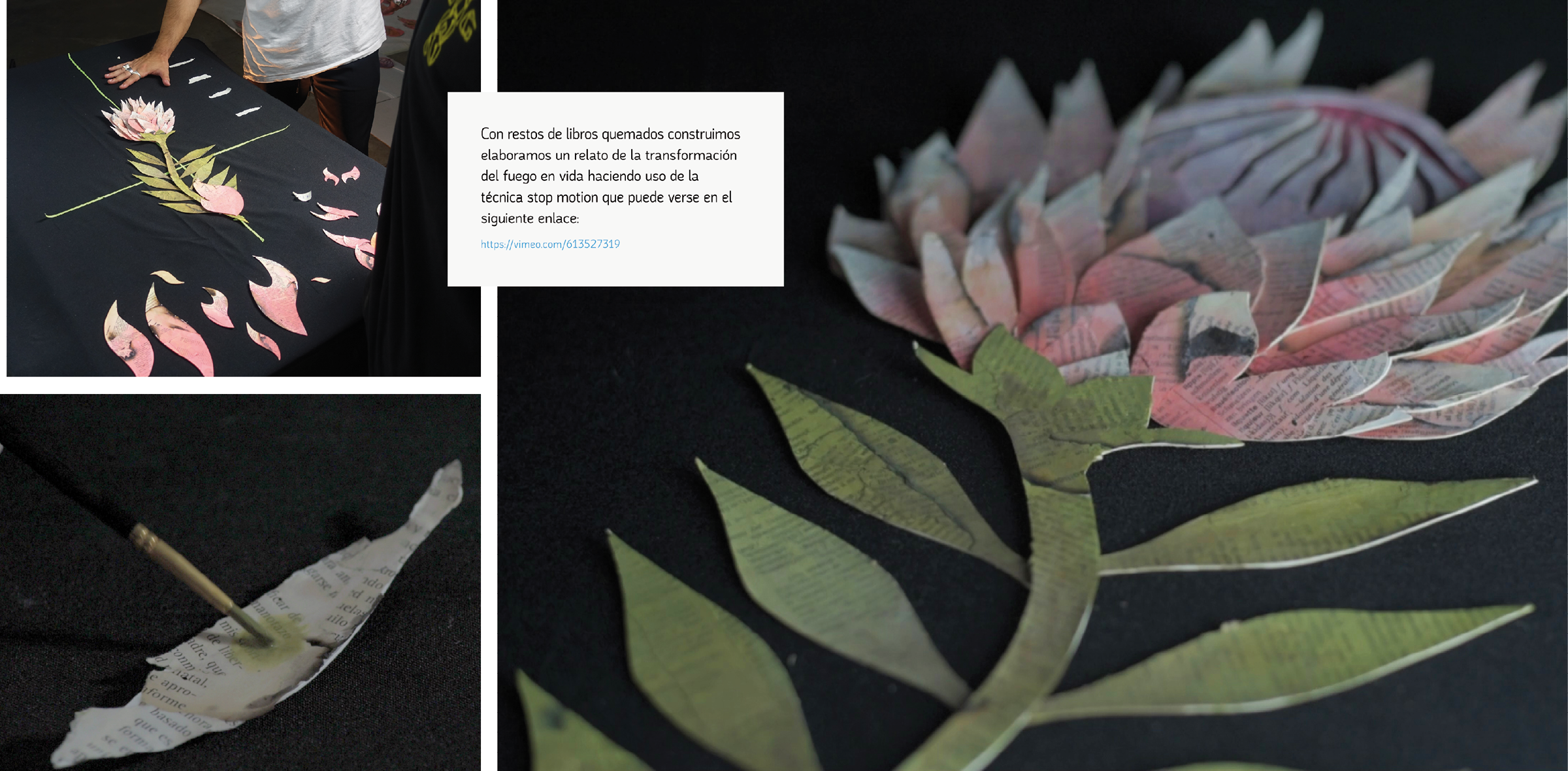 Ya teníamos concepto y símbolo; ahora tocaba representarlo haciendo justicia a la propia flor protea que renace de sus cenizas. Y es eso justamente lo que quisimos hacer: crearla, literalmente, a partir de las cenizas del incendio. Para ello, dejamos el ordenador a un lado y acudimos al lugar del desastre para empaparnos de éste. Recorrimos los pasillos calcinados de la librería Proteo, rescatamos libros a medio carbonizar y nos manchamos las manos para recoger de entre sus páginas cientos de fragmentos a los que dimos forma, encolamos y acuarelamos; cientos de fragmentos que hemos ido disponiendo para componer esta flor que simboliza el movimiento #TodosConProteo y que juega con los límites entre la realidad y la abstracción; entre lo literal y lo simbólico (La Rubia de Prado, 2009).
